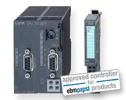 The CP-040 communications processor in the SLIO system and the CP240 in the 200V system are both ideally suited for integrating ebm-papst GreenTech EC fans into external control systems. The MODBUS-RTU protocol is used as the transfer protocol. In the 200V system, transfer is routed via the integrated RS485 interface (model number CPU 214SER). In the SLIO system it is routed via the optional RS485 module (article number VIPA CP-040-1CA00).